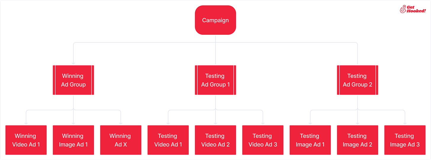 The goal is to find more winning ads week over week so you can extend your winning ad group and scale your campaign with more budget.